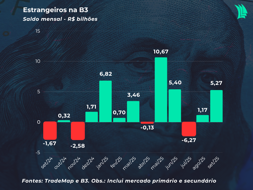 Setembro foi marcado por uma forte entrada de capital estrangeiro na B3, com saldo líquido positivo de R$ 5,267 bilhões, o maior do segundo semestre de 2025 até agora. O resultado não apenas superou com folga os R$ 1,168 bilhão registrados em agosto, como também confirmou o segundo mês consecutivo de aportes após a saída de R$ 6,268 bilhões em julho. Ainda assim, o volume ficou um pouco abaixo dos R$ 5,390 bilhões de junho e distante dos R$ 10,662 bilhões de maio. O contraste em relação ao mesmo período do ano passado é expressivo: em setembro de 2024 houve saída líquida de R$ 1,671 bilhão.