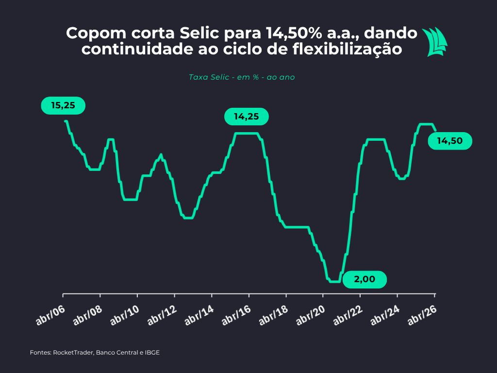 O cenário externo também pesou na calibração do ritmo: conforme divulgado na última ata, a incerteza global aumentou em função dos conflitos no Oriente Médio. Essa volatilidade exige maior prudência na condução da política monetária, justificando a opção da autoridade monetária por um ajuste de menor magnitude neste momento.