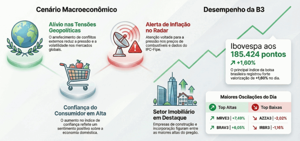 Nesta quarta-feira (25), o Ibovespa fechou em alta de 1,60%, superando os 185.420 pontos e acumulando seu terceiro pregão consecutivo de valorização. A perspectiva de arrefecimento do conflito no Oriente Médio, que completará seu primeiro mês ao final de março, reduziu o valor do petróleo e elevou positivamente as perspectivas de avanço no campo geopolítico.