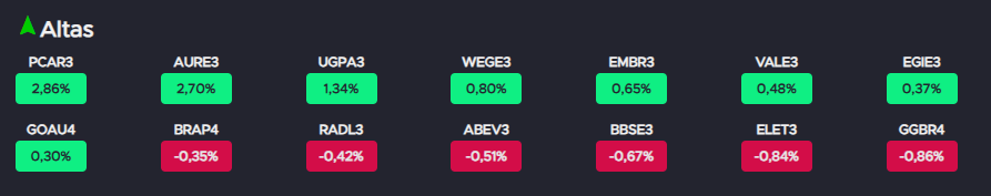 A Auren (AURE3) também apresentou bom desempenho, com valorização de 2,70% na semana. O avanço ocorreu após o J.P. Morgan elevar o preço-alvo da ação de R$ 11,50 para R$ 13,60, mantendo recomendação neutra. A revisão indica potencial de valorização superior a 30%, refletindo maior otimismo do mercado em relação ao desempenho operacional da elétrica.