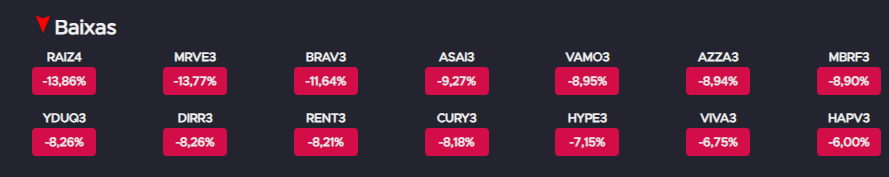 No campo negativo, a Raízen (RAIZ4) liderou as perdas, com forte queda de 13,86% na semana. As ações atingiram patamar inferior a R$ 0,90, o menor valor desde o início das negociações da empresa. Segundo a agência Broadcast, os títulos de dívida externa (bonds) da companhia também recuaram significativamente, refletindo preocupações com o ritmo de consumo de caixa. Há percepção no mercado de que o aporte de R$ 10 bilhões realizado pela Cosan (CSAN3) pode não ser suficiente para reequilibrar as finanças do grupo.