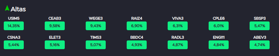 A Copel (CPLE6) cresceu 6,01% e ganhou destaque ao ser incluída na carteira ESG do BTG Pactual, que seleciona companhias com práticas sustentáveis e retorno consistente. Desde a privatização, a elétrica vem entregando resultados sólidos, beneficiando-se de preços elevados de energia e da produção 100% renovável. A empresa também investe em descarbonização da frota e em capacitação de funcionários, além de ter aprimorado seus padrões de governança corporativa.