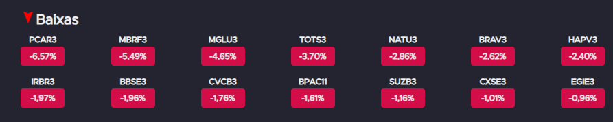 O GPA (PCAR3) liderou as quedas com 6,57% após mudanças no conselho de administração. O empresário André Coelho Diniz foi eleito presidente do colegiado, e Edison Ticle de Andrade Melo e Souza Filho, executivo da Minerva Foods, assumiu como vice-presidente. A troca de comando gerou incertezas sobre os próximos passos estratégicos da companhia, impactando o desempenho das ações.