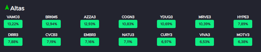 A Cogna (COGN3) subiu 10,83%, apoiada pela revisão para baixo das expectativas de inflação no Boletim Focus, que favoreceu companhias voltadas ao mercado doméstico. O anúncio da oferta para fechamento de capital da subsidiária Vasta, listada na Nasdaq, reforçou a percepção positiva sobre a reestruturação estratégica da companhia.