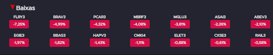 A Fleury (FLRY3) liderou as quedas da semana, recuando 7,25%, em meio às incertezas sobre as negociações com a Rede D’Or. A companhia afirmou que não há decisão sobre suspensão ou continuidade das tratativas, que seguem em andamento.