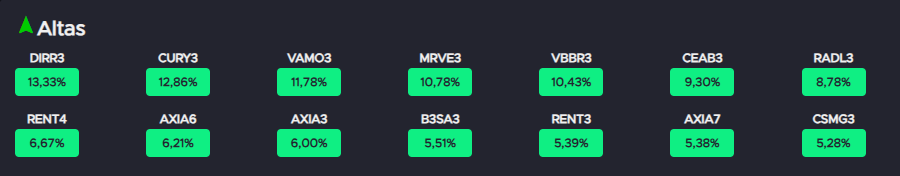 Já a Cury Construtora (CURY3) teve valorização de 12,86%, após aprovar a distribuição de R$ 140 milhões em dividendos, o equivalente a R$ 0,4544752263 por ação, reforçando sua política de remuneração aos acionistas e sinalizando confiança na solidez financeira da companhia.