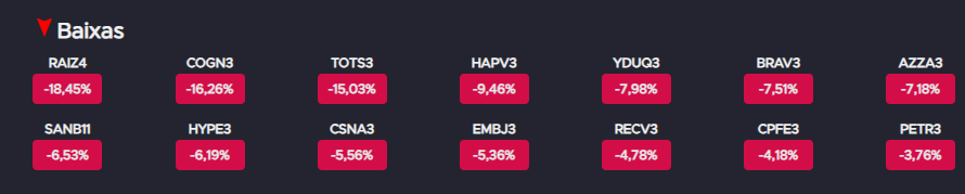 Cogna (COGN3) recuou 16,26%, mesmo em um ambiente considerado construtivo para a companhia. Recentemente, executivos da empresa se reuniram com analistas do Goldman Sachs para discutir perspectivas de captação de alunos, expansão em cursos de medicina e estratégias de longo prazo, incluindo alocação de capital.