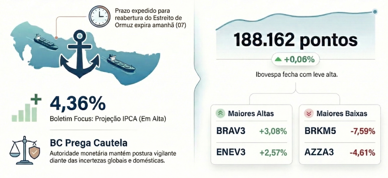 O Ibovespa encerrou esta segunda-feira (06) aos 188.162 pontos, registrando uma leve valorização de 0,06%. A volatilidade do índice ao longo do pregão refletiu a instabilidade do cenário internacional e o fluxo constante de notícias sobre o conflito envolvendo Irã, Estados Unidos e Israel. Em pronunciamento hoje, o presidente norte-americano, Donald Trump, estabeleceu que o prazo para a reabertura do Estreito de Ormuz expira amanhã (07). Trump reiterou que a falta de uma concessão iraniana levará à intensificação de ataques à infraestrutura do país, o que inauguraria um novo e crítico capítulo na guerra. Em contrapartida, o chanceler iraniano, Abbas Araghchi, declarou que as ações dos Estados Unidos terão consequências que não se limitarão ao Irã ou à região, prometendo uma retaliação de proporções vastíssimas.