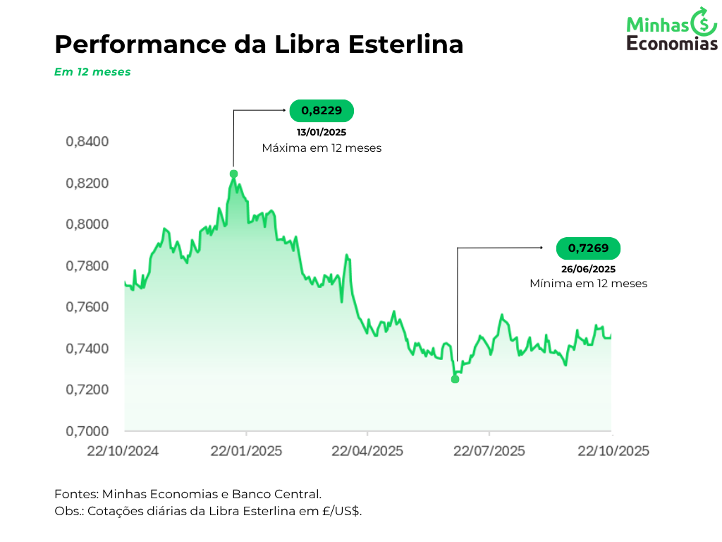Para ilustrar o comportamento recente da moeda, o gráfico a seguir apresenta a variação da libra esterlina em 12 meses, destacando suas principais tendências e movimentos cambiais no período.