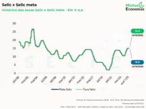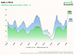 Nos anos 1980 e 1990, a Selic superou 40% ao ano em meio à hiperinflação. Com o Plano Real em 1994, a economia se estabilizou e a taxa passou a ser ajustada pelo Copom, criado em 1996. Desde então, seguiu trajetória de queda gradual, chegando a 2% ao ano em 2020, durante a pandemia, e voltando a 13,75% em 2023 por causa da inflação global. Em 2025, está em 15,00% ao ano.
