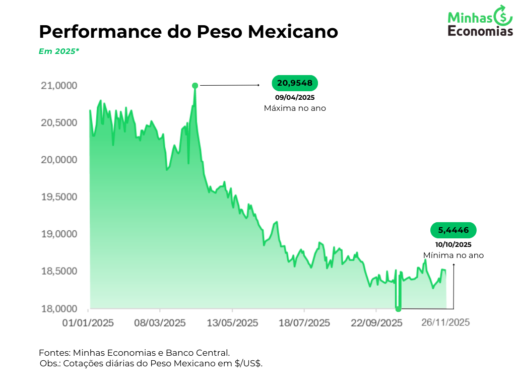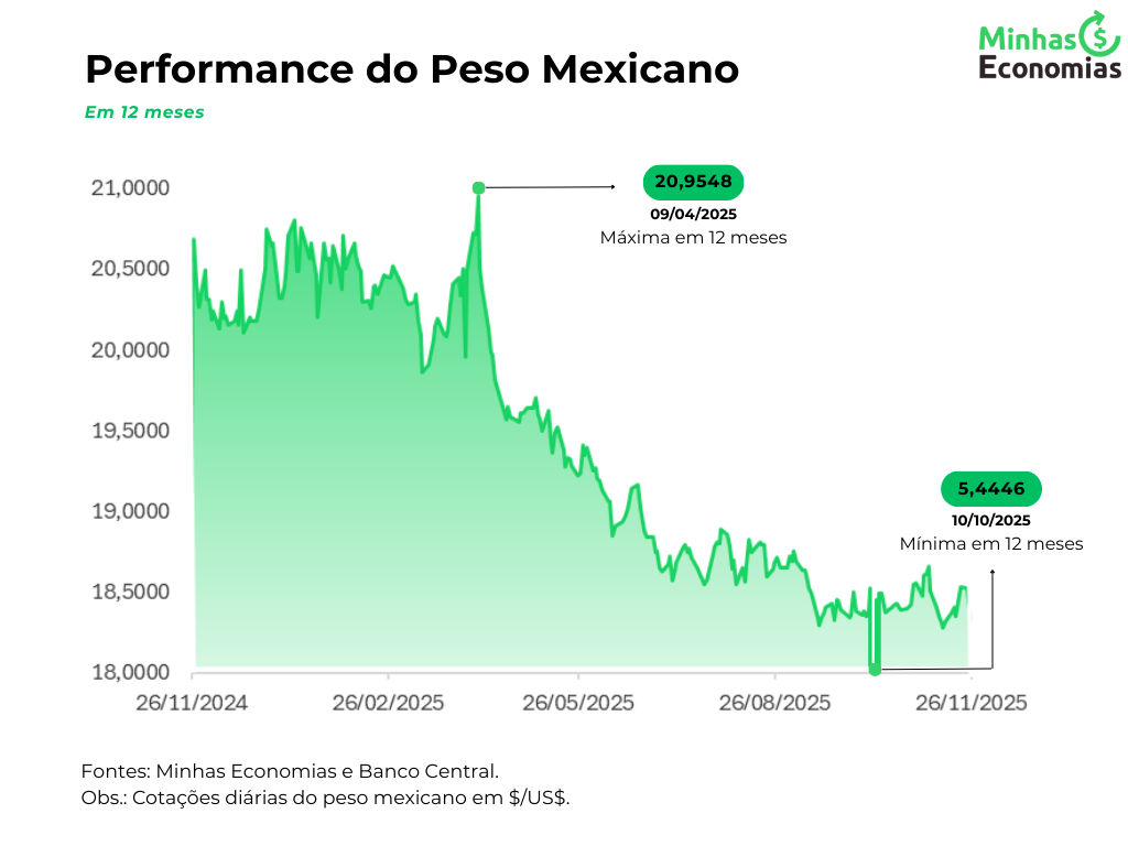 Confira abaixo a variação do peso mexicano em 12 meses para uma análise mais detalhada de seu desempenho.
