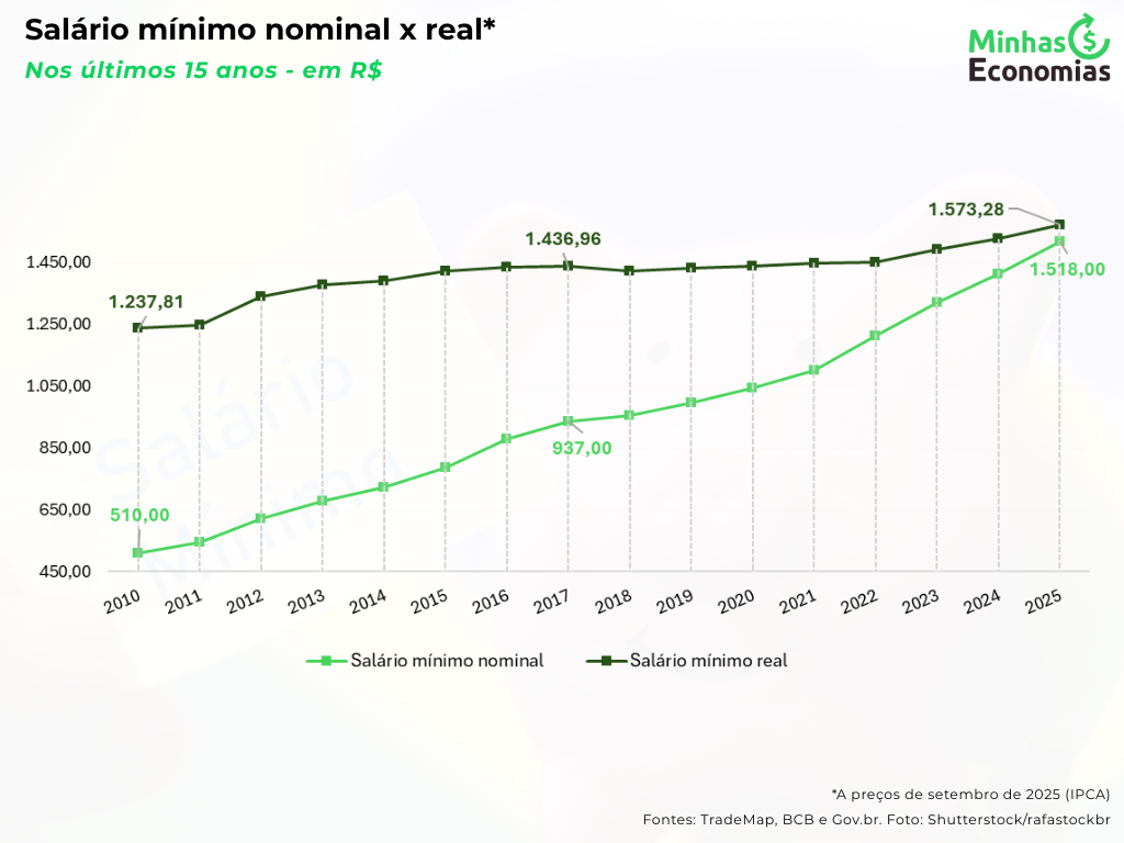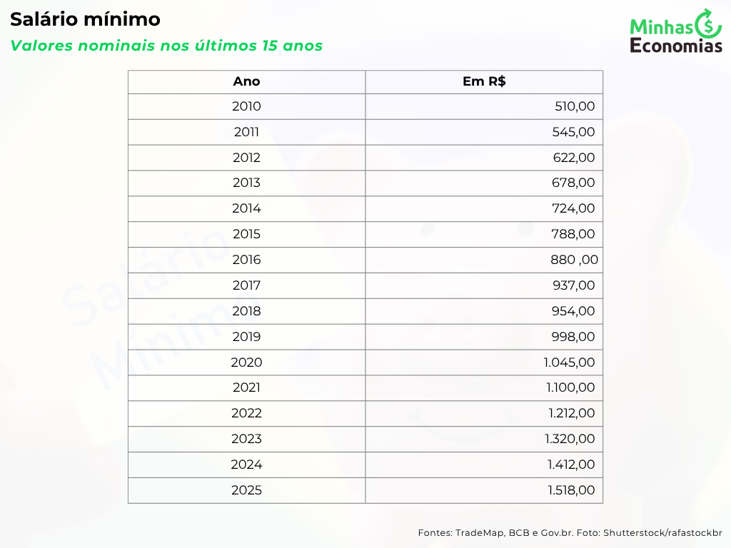 No dia 1º de janeiro de 2025 houve o mais recente reajuste no valor do salário mínimo, passando de R$1.412,00 (em 2024) para R$1.518,00, um aumento de 7,5%.