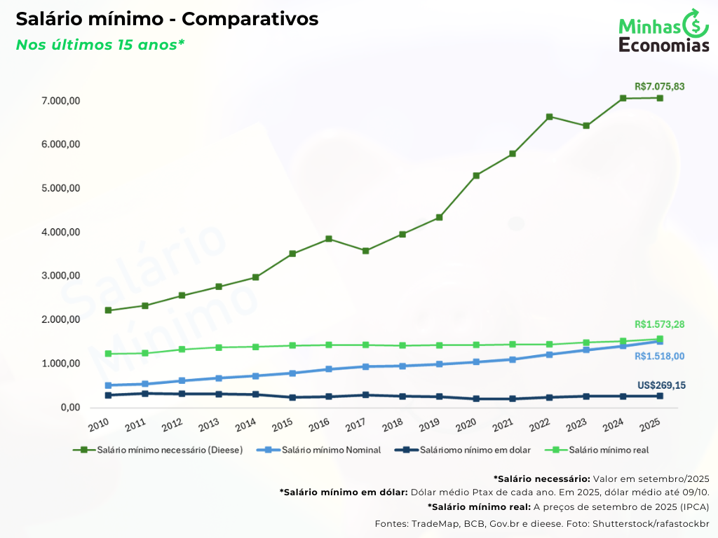 O DIEESE (Departamento Intersindical de Estatística e Estudos Socioeconômicos) calcula mensalmente o salário mínimo necessário para cobrir as despesas básicas de uma família com dois adultos e duas crianças, conforme estabelece a Constituição Federal. Esse valor leva em conta gastos essenciais com alimentação, moradia, saúde, educação, vestuário, higiene, transporte, lazer e previdência. Em setembro de 2025, o salário mínimo necessário foi estimado em R$7.075,83, enquanto o salário mínimo oficial é de R$1.518,00. A diferença entre esses valores revela o quanto o salário vigente está distante de atender plenamente às necessidades de uma família, apontando para a importância de políticas que promovam maior equilíbrio entre remuneração e custo de vida.