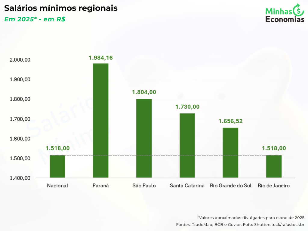 Dito isso, 5 estados brasileiros definem pisos regionais, sendo eles: Paraná, São Paulo, Rio de Janeiro, Rio Grande do Sul e Santa Catarina.