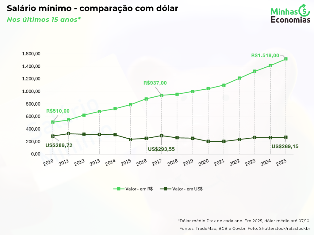 A evolução do salário mínimo brasileiro também pode ser observada sob a ótica do dólar, considerando a conversão pelo câmbio médio anual. Entre 2010 e 2024, o valor nominal em reais cresceu de R$ 510 para R$ 1.412, enquanto seu equivalente em dólares variou de aproximadamente US$ 289,72 para US$ 262,10. Apesar da valorização expressiva em reais, a oscilação cambial influenciou a conversão para a moeda americana, resultando em um comportamento menos linear. Ainda assim, a trajetória geral indica manutenção do poder de compra internacional ao longo do período, com destaque para picos como o de 2011 (US$ 325,37) e 2023 (US$ 264,29).